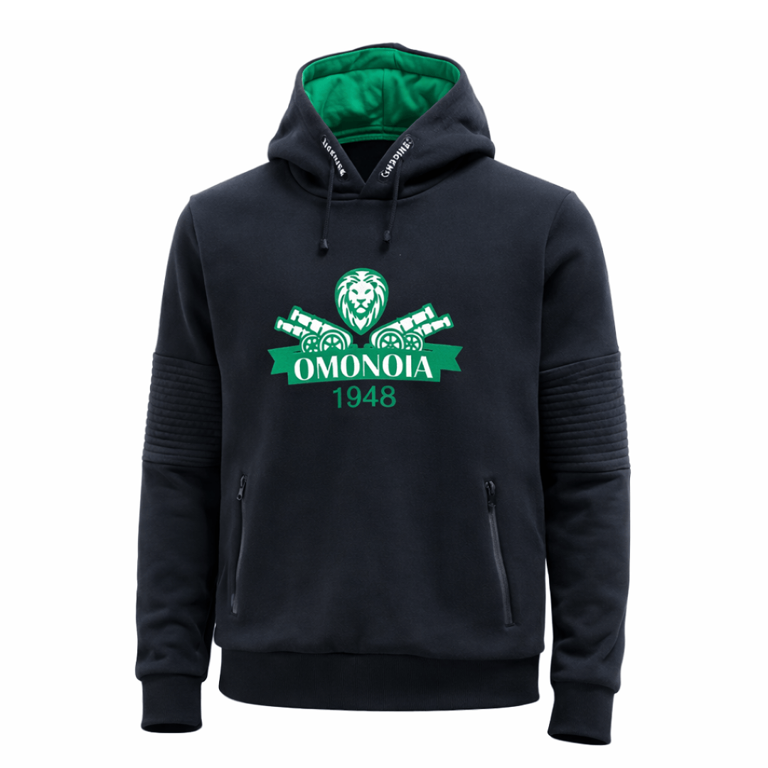 Στο μπροστινό μέρος δεσπόζει το εντυπωσιακό σχέδιο «OMONOIA» με λιοντάρια και άρματα, που συμβολίζει τη δύναμη, την αντοχή και την περηφάνια. Το εσωτερικό του φούτερ είναι πράσινο στο μέρος της κουκούλας, προσθέτοντας μια ξεχωριστή λεπτομέρεια και επιπλέον ζεστασιά στα χρώματα της ΟΜΟΝΟΙΑΣ.